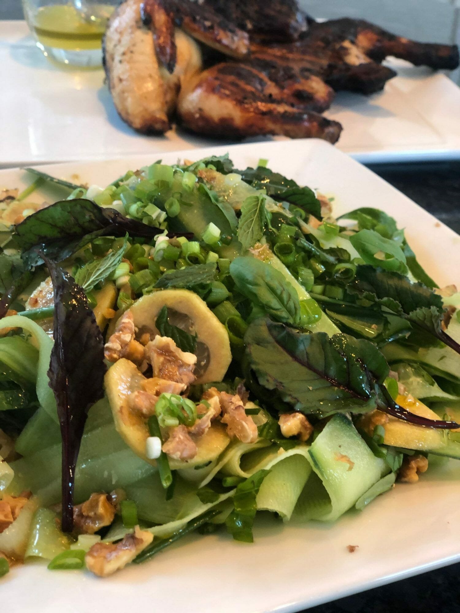 Add the fejoas, herbs, spring onions and baby beetroot leaves in with the cucumber. Gently toss to combine.