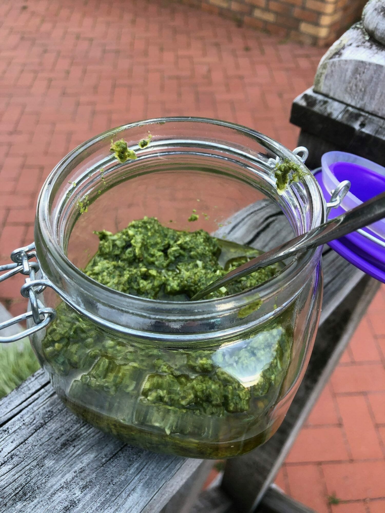 To store pesto in the fridge: Pesto darkens if exposed to air so place in a jar and either cover with cling film making sure it is touching the pesto or top up with more olive oil. This will keep in the fridge for 2-3 weeks